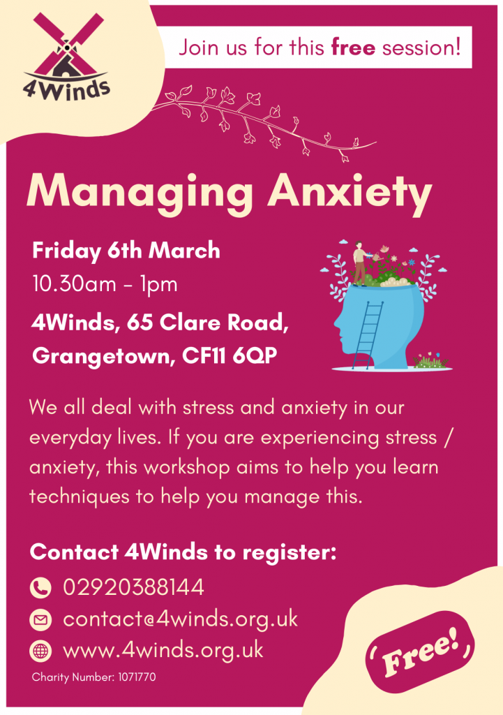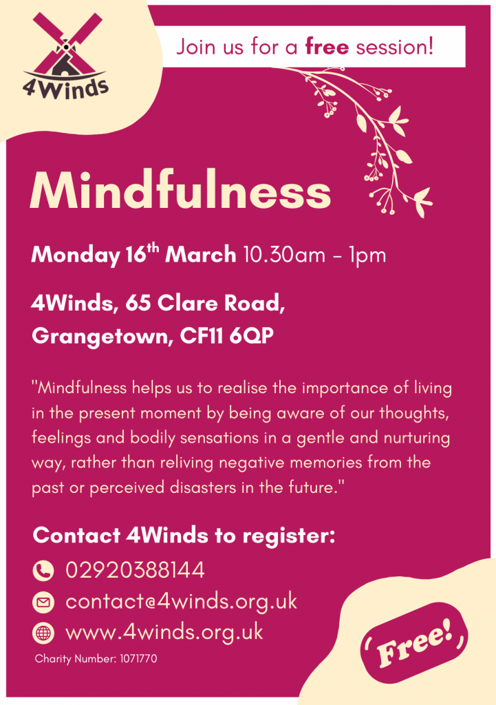 To book :PLEASE NOTE: Due to Covid restrictions places are limited and advanced booking is essential – to secure your place please contact 4Winds on 02920 388144, use the contact us form on our website www.4winds.org.uk or email contact@4winds.org.uk